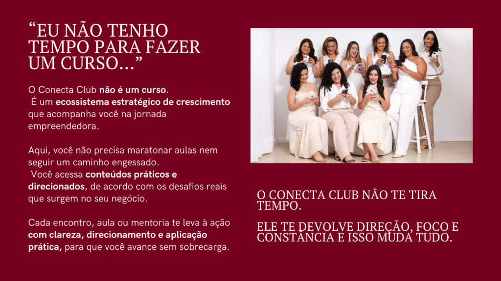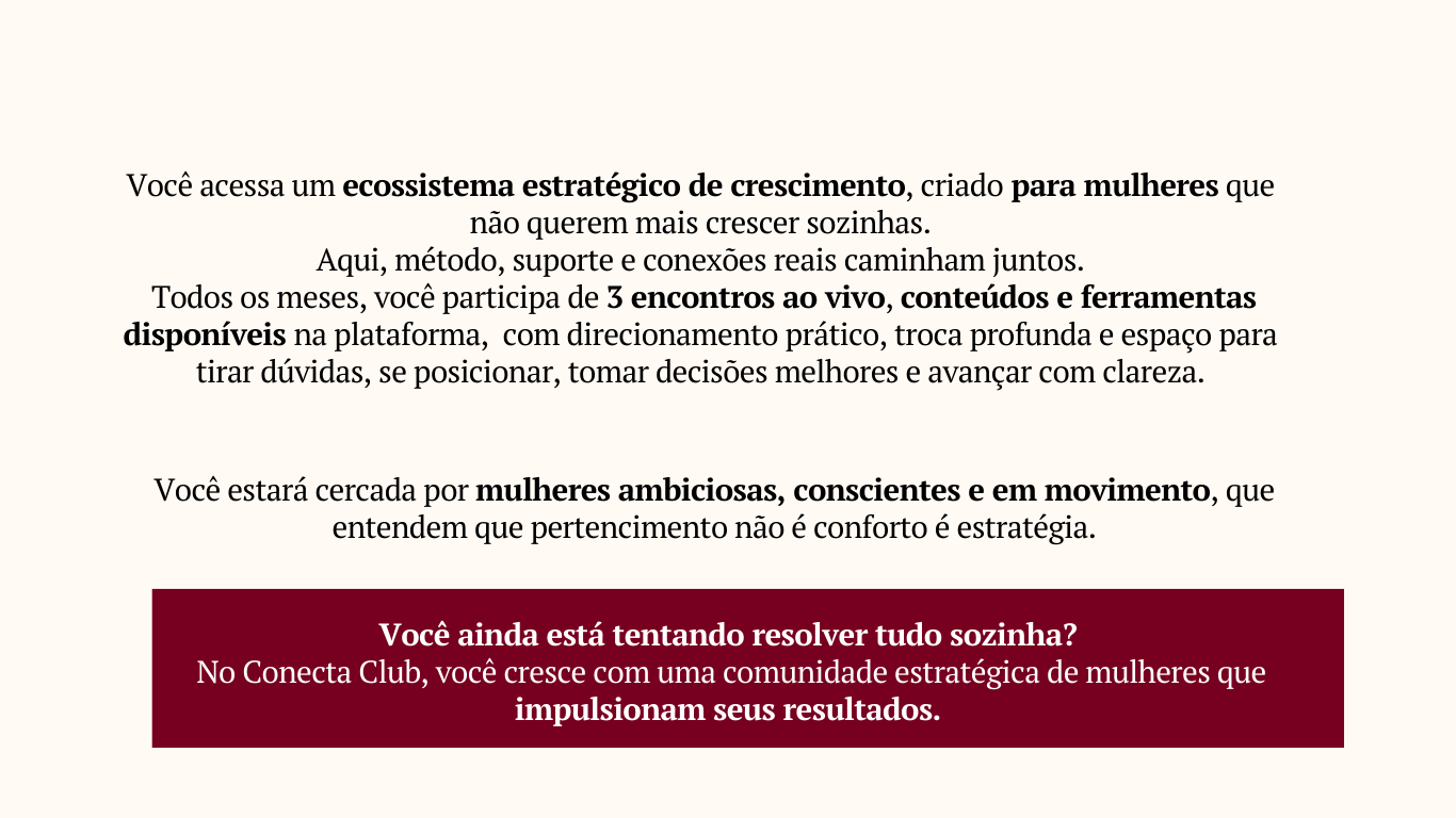 O Conecta Club 2.6 é uma comunidade estratégica para mulheres que querem vender com constância, se posicionar com confiança e liderar suas marcas com autenticidade.