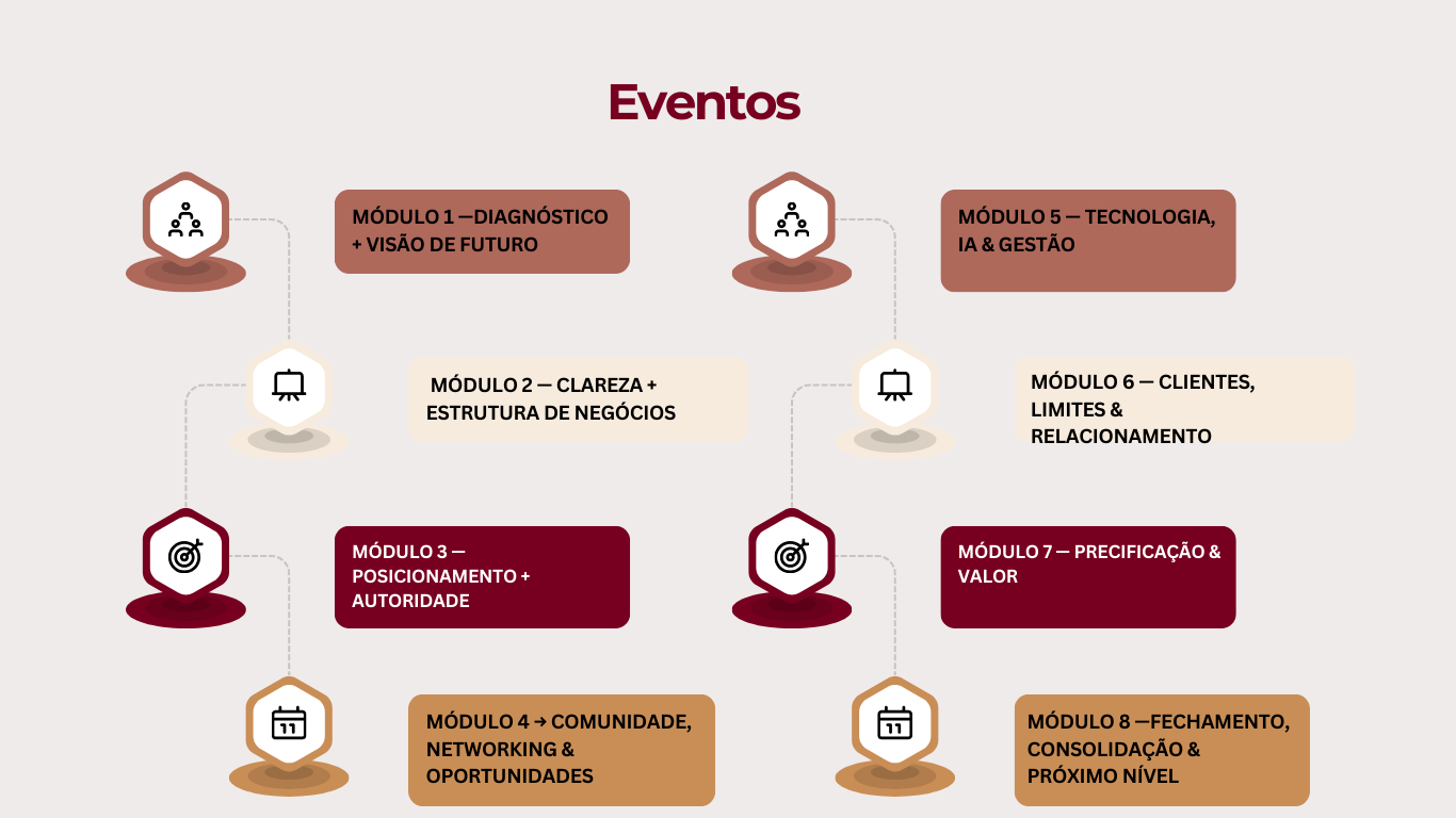 Ao longo de 12 meses, 10 mentoras estratégicas conduzem sua jornada do alinhamento à construção de destaque no mercado.
